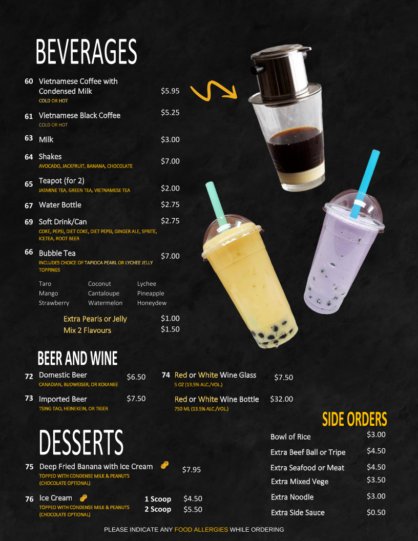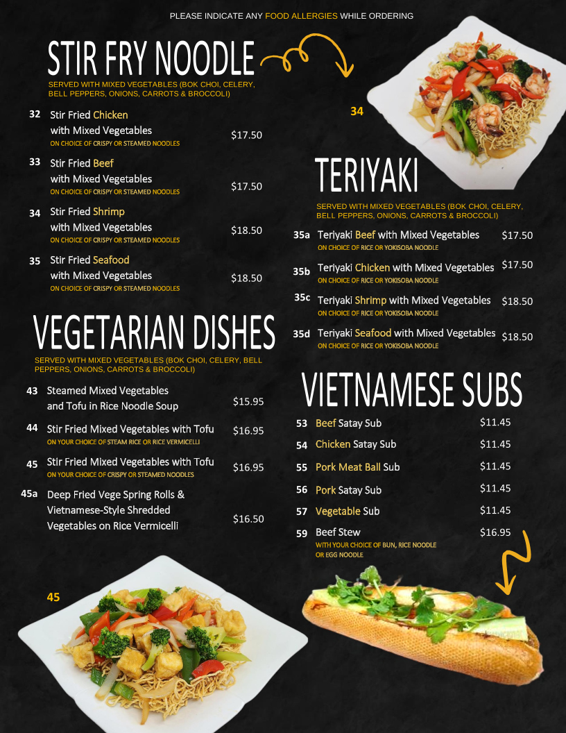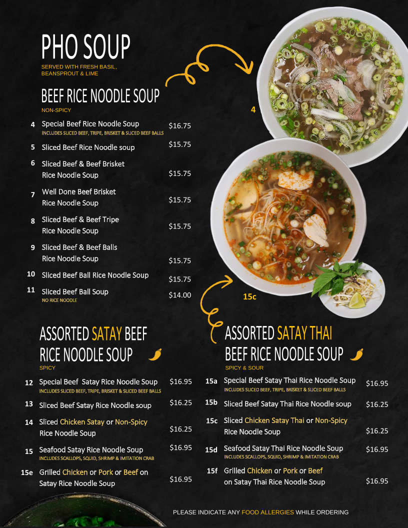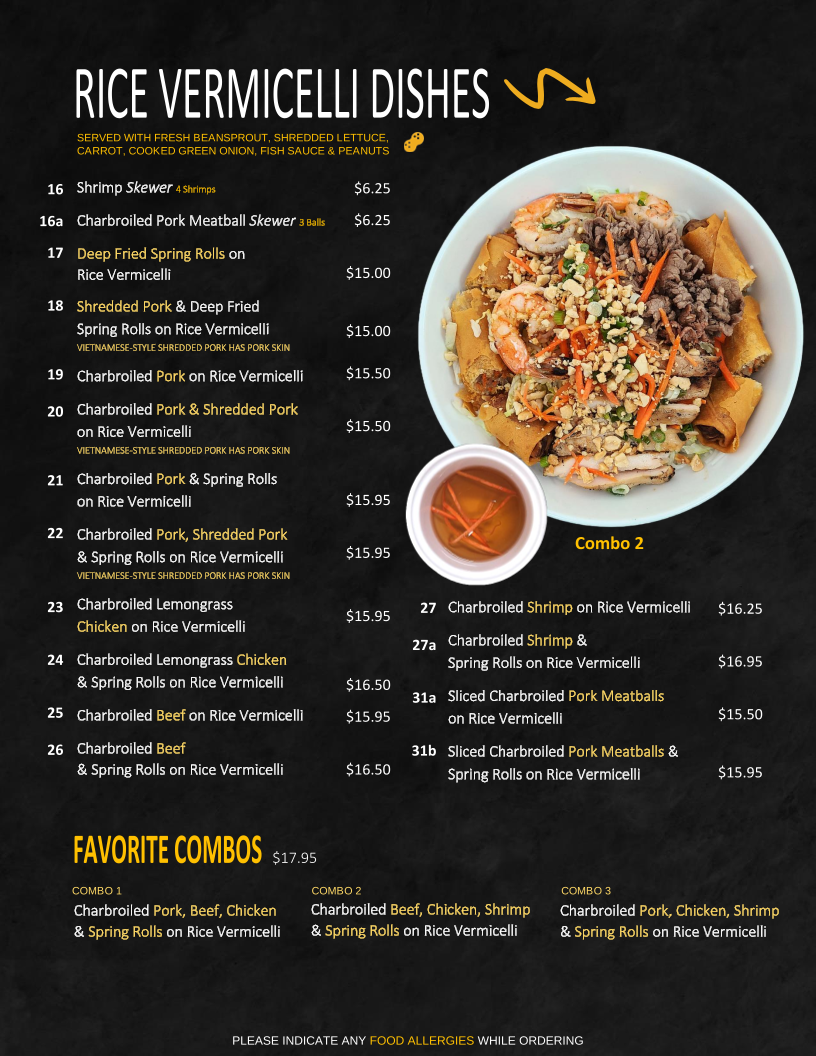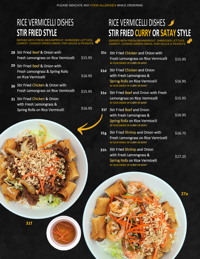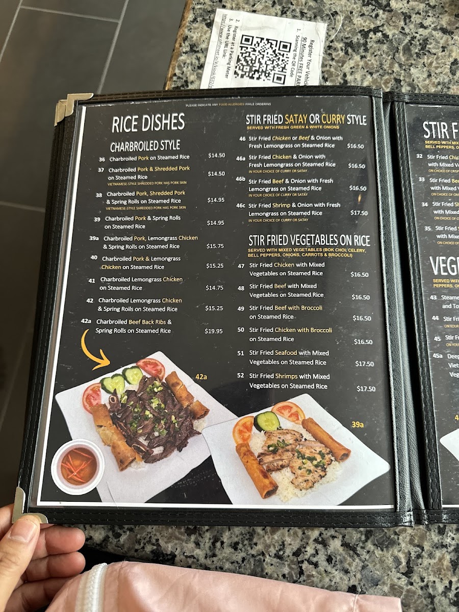 Pho Express offers an authentic Vietnamese experience right in Calgary, specializing in pho, rice dishes, and classic combos. Their menu stands out for generous portions and vibrant flavors. The Combo 1, featuring charbroiled pork, beef, chicken, shrimp, and spring rolls over rice vermicelli, perfectly balances freshness and savory depth. Stir-fried options, like the curry or satay-style beef with lemongrass on steamed rice, showcase skillful seasoning and tender proteins. Vegetables are fresh and crisp, complementing hearty proteins in dishes like stir-fried shrimp with vegetables on rice.